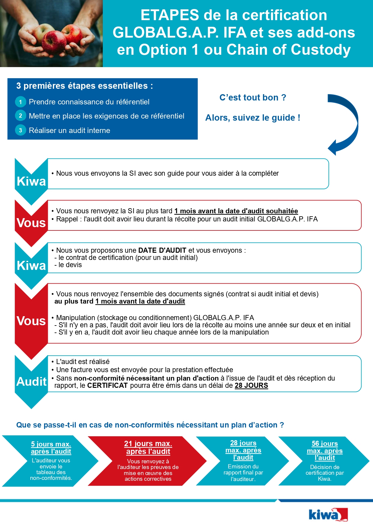 En tant qu'organisme de certification accrédité pour GLOBALG.A.P., Kiwa peut certifier les opérations qui relèvent des fruits et légumes, des fleurs et des plantes ornementales, des grandes cultures (telles que les céréales et le maïs), du thé et des produits de l'aquaculture (y compris les poissons et les crustacés), ainsi que fournir une certification de la chaîne de traçabilité. Kiwa est également accrédité pour l'évaluation GRASP.