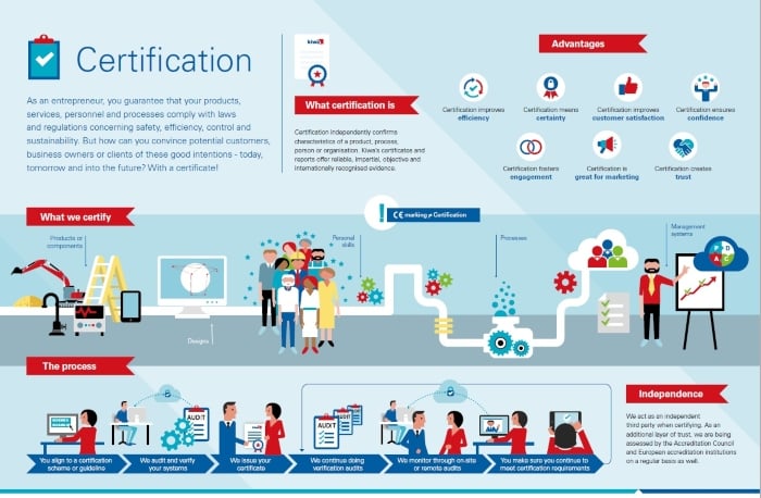 You have decided that you want your product, process, service, (management) system or person(s) to be certified according to a certain certification scheme. (Not sure yet? Here are the advantages of certification.) Kiwa helps you from start - aligning your company - to finish - handing you your certificate.