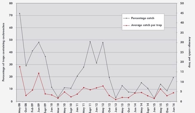 The black plot line shows the proportion of the monitors that have caught cockroaches (a measure of their distribution), whilst the red line shows the numbers caught (a measure of the degree of infestation). What was an extremely heavy infestation in 2008 has been reduced to a much lower level now (eradication is probably impossible at this site). The ‘blip' in late 2011 was caused by poor performance from the incumbent pest control contractor, and resulted in them being replaced.