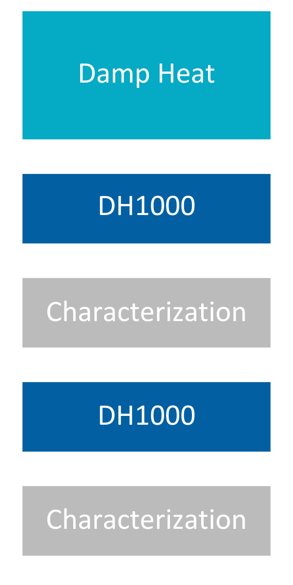 DH subjects modules to a constant 85°C and 85% relative humidity in an environmental chamber for two periods of 1000 hours each. This test is twice the duration required for IEC certification in order to identify additional module failure modes where the combination of high heat and intense moisture stresses the PV module layers. Characterizations are conducted every 1000 hours. | ![]() |