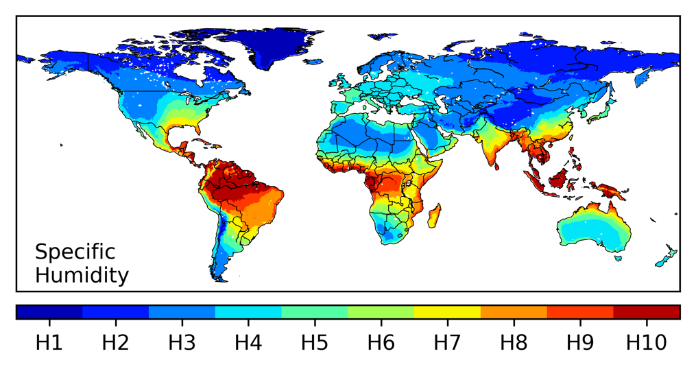 Specific Humidity zones across the globe according to the Photovoltaic Climate Zone classification system.
