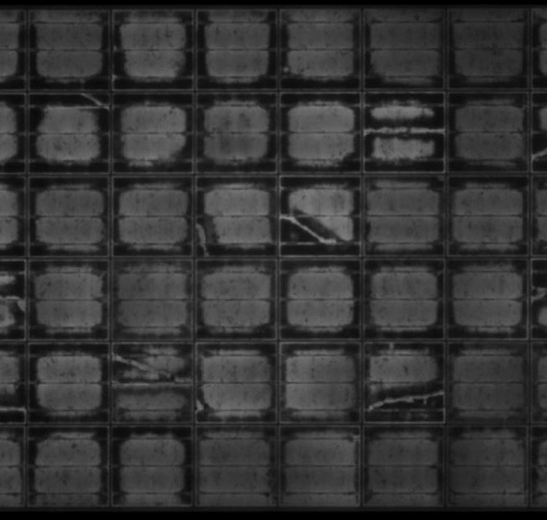 The lighter color around the cells’ perimeter is visual evidence of corrosion. | The site owner arranged for a sample of modules to be sent for EL imaging, where signs of corrosion around the cells’ perimeter were even more obvious. |
