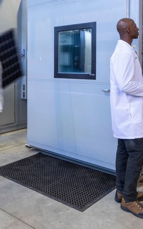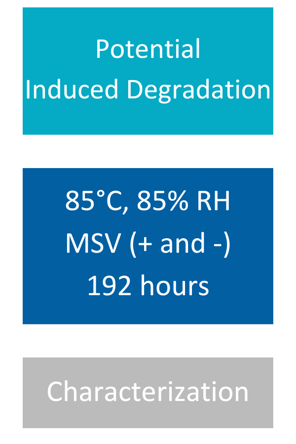 Modules are placed in an environmental chamber at 85°C and 85% relative humidity for 192 hours while a voltage bias equal to the maximum system voltage rating of the module (typically + and − 1500V) is applied. These conditions cause PID to occur in susceptible modules. The test duration is twice that of IEC 61215:2021’s PID test.