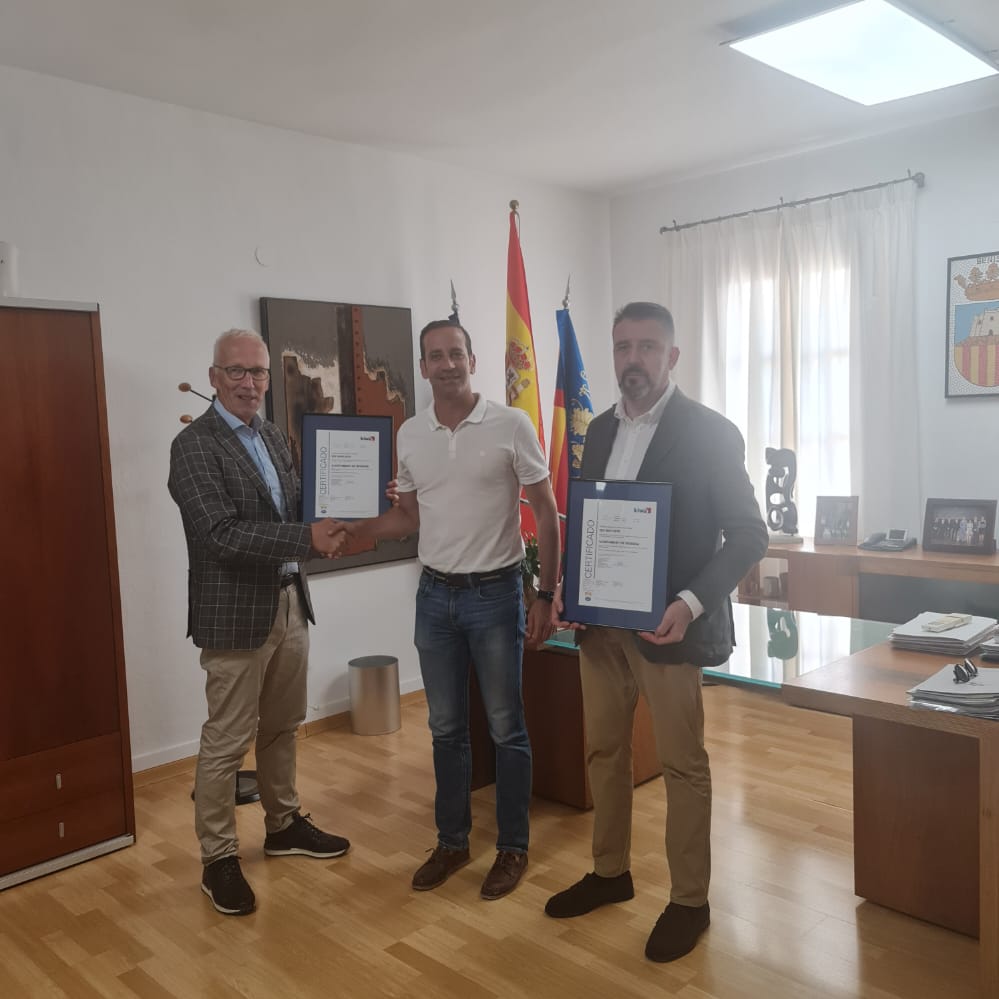 En el acto, celebrado en el consistorio de la localidad alicantina, Ad Besemer, Vicepresidente Internacional de Kiwa Assurance NL, y Juan Sendín, Director de Desarrollo de Negocio de Kiwa para España y Latam, hicieron entrega de ambos certificados al alcalde de Benissa, Arturo Poquet Ribes.
