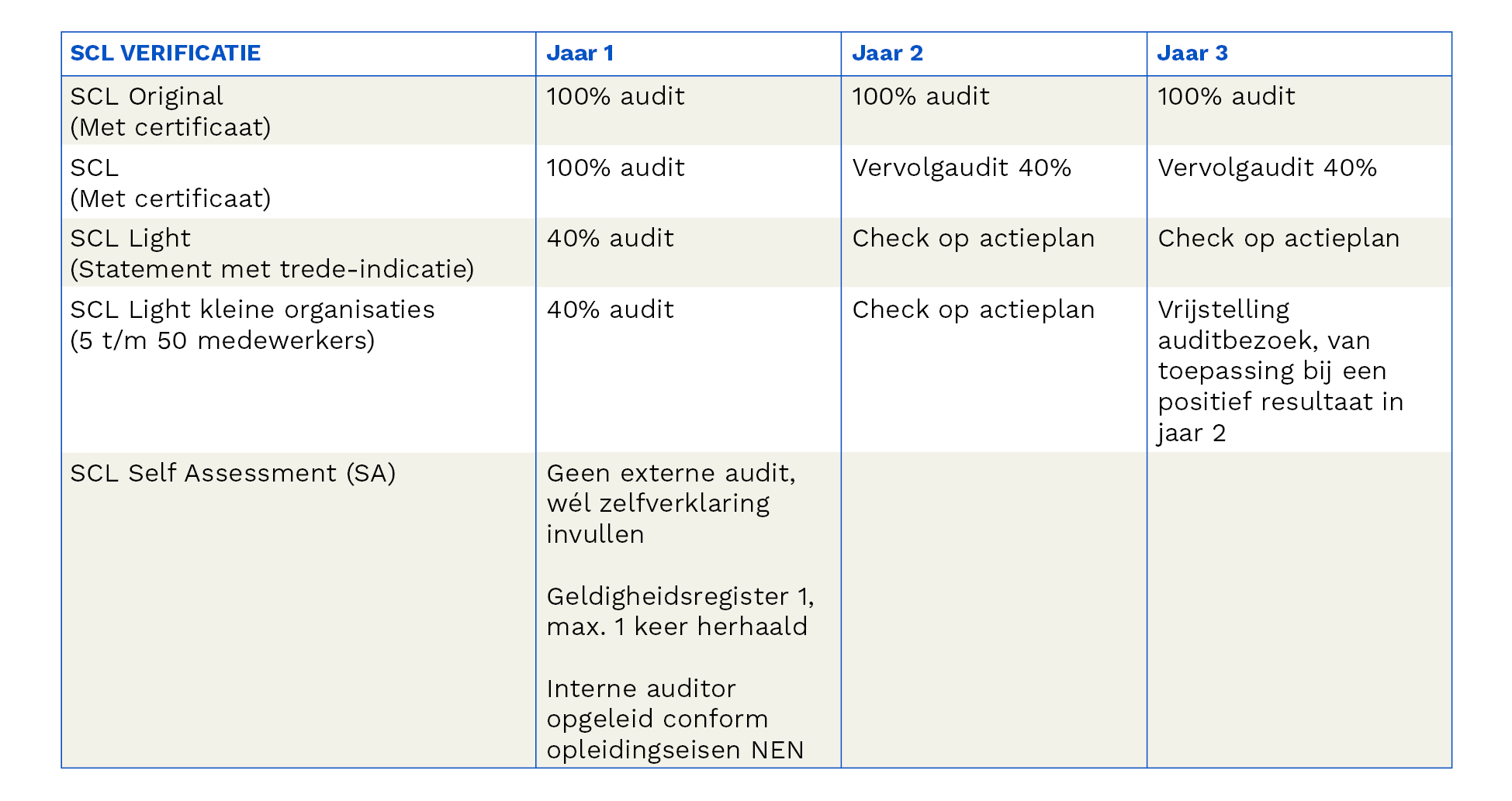 In onderstaand overzicht vindt u een compleet overzicht van de beschikbare SCL-producten. Het aanbod loopt uiteen van de SCL Original (waarbij elk jaar de volledige audit plaatsvindt) tot een Light variant voor kleinere organisaties en een Self Assessment dat uw organisatie helpt om laagdrempelig met SCL kennis te maken. Kiwa kan al deze producten certificeren en u helpen een keuze te maken voor een bepaalde SCL-variant.