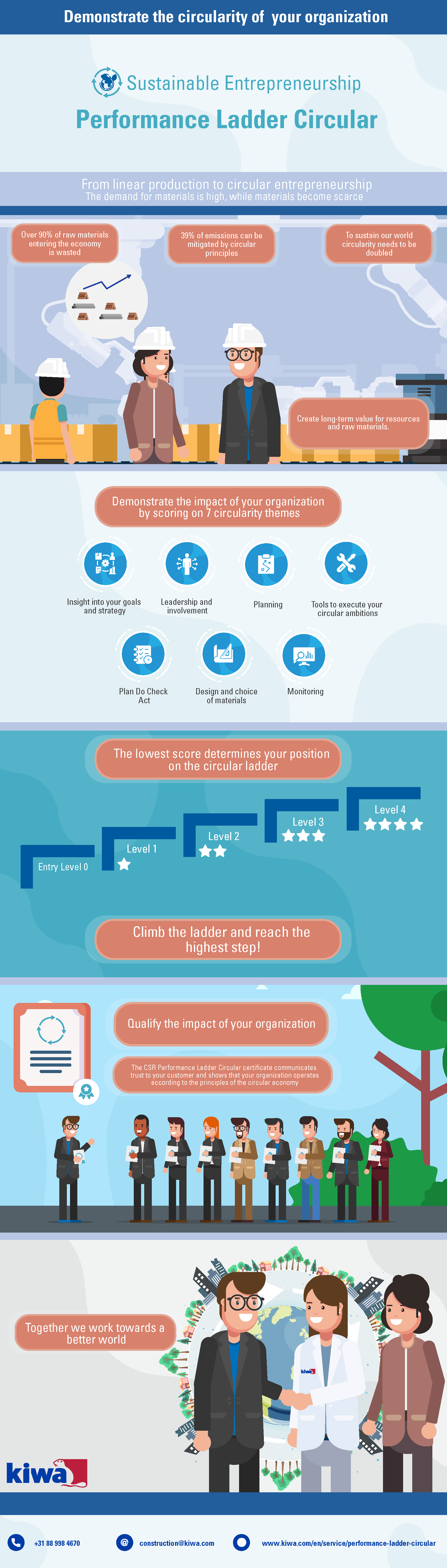 Nederland Circulair in 2050: Nederland met een volledig circulaire economie in 2050. Een circulaire economie is een economie zonder afval, waarbij alles draait op het oneindig hergebruik van grondstoffen. De Prestatieladder Circulair maakt de omslag naar circulair ondernemen concreet en aantoonbaar. Kiwa heeft een infographic gemaakt om het belang van circulair ondernemen te laten zien.
