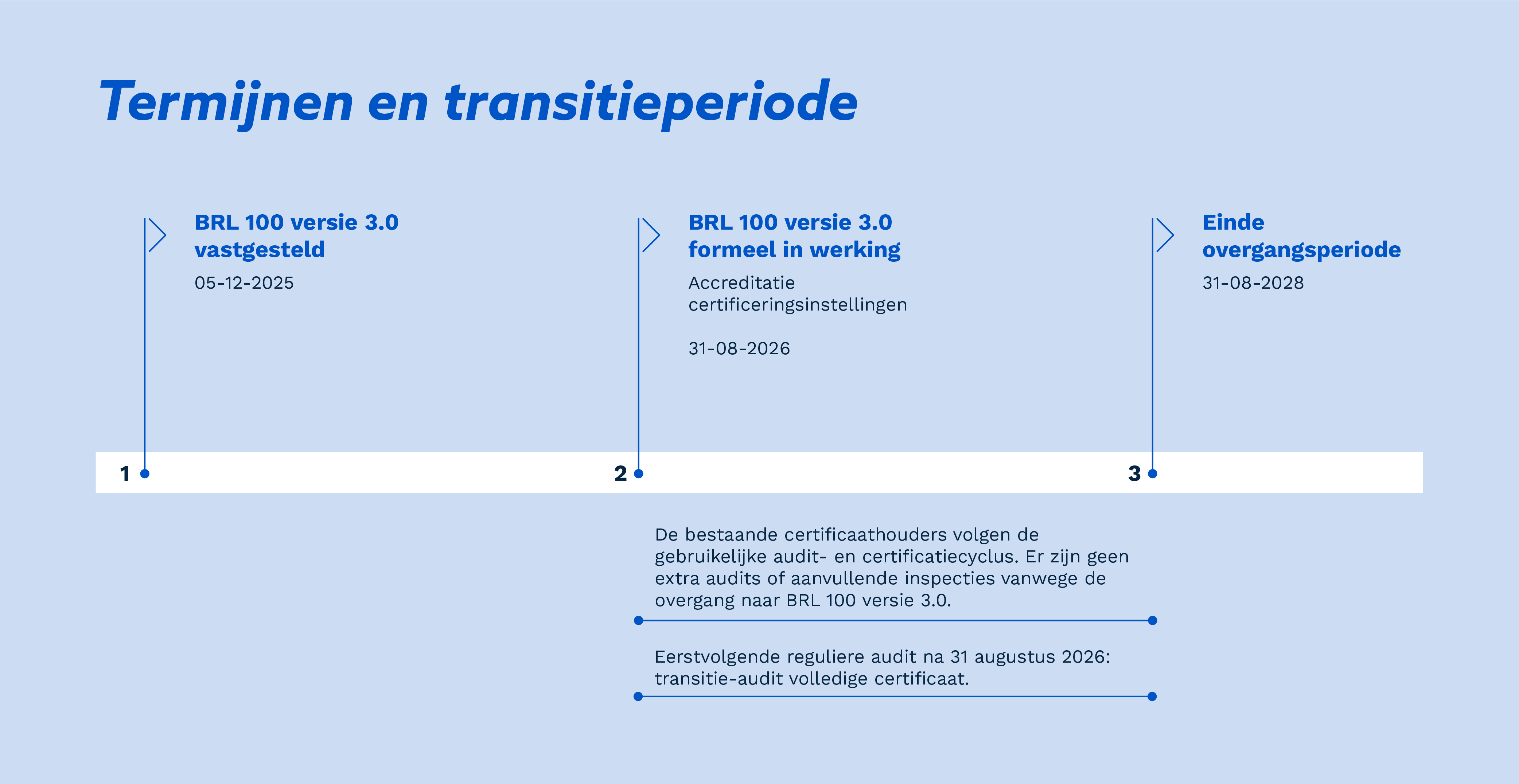 BRL 100 versie 3.0 treedt formeel in werking en er worden geen versie 2.0-certificaten meer afgegeven. Audits en inspecties volgens BRL 100 versie 3.0 worden uitgevoerd binnen de reguliere certificatiecyclus van de onderneming. Na 31 augustus 2026 worden alle reguliere audits uitgevoerd volgens BRL 100 versie 3.0. Er worden geen aanvullende of tussentijdse audits opgelegd.