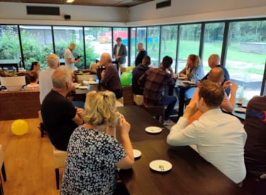 Op dinsdag 6 juli jl. was onze collega Hans Buurman, unitmanager Testing Materials, maar liefst 40 jaar in dienst bij Kiwa KOAC. Uiteraard hadden we graag een receptie georganiseerd om dit samen met klanten en collega’s te vieren, maar helaas was dit vanwege corona niet mogelijk. Toch wilden we Hans op deze dag graag in het zonnetje zetten middels een mooi alternatief. Na een gezellig ontbijt samen met Ties Joosten werd Hans opgehaald in een mooi versierde meetwagen van Road Testing en naar Kiwa Apeldoorn gebracht. Daar stonden de collega’s van de unit Testing Materials hem al op te wachten. Binnen waren ook de andere collega’s van Kiwa KOAC Apeldoorn aanwezig en samen hebben we genoten van koffie met gebak.