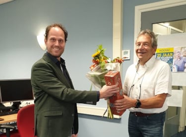 Mark de Man overhandigt bloemen en cadeau aan Leo Verbraak