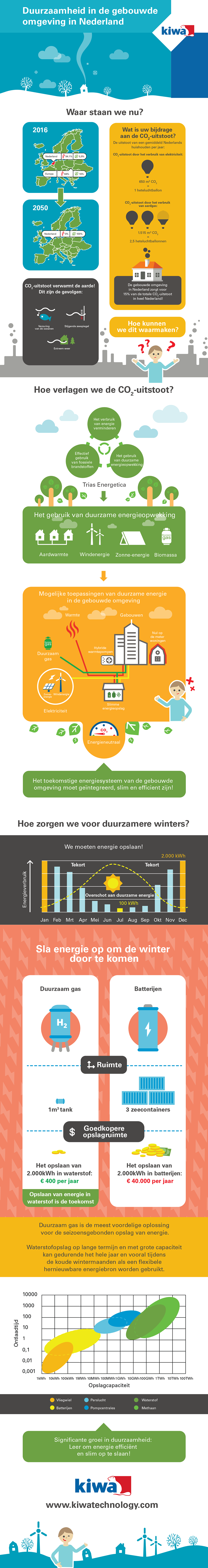 In de infographic ‘Duurzaamheid in de gebouwde omgeving in Nederland’ brengen de experts van Kiwa Technology op heldere wijze in beeld voor welke uitdagingen staan als het gaat om het terugdringen van de CO2-uitstoot en welke oplossingen daarbij denkbaar zijn. Dat duurzaam gas een belangrijke plek zal innemen in de energievoorziening van de toekomst, is voor Kiwa Technology klip en klaar. Het overschot aan zonne- en windenergie van bedrijven en particulieren opslaan in waterstof is dé sleutel op weg naar een duurzame en flexibele energie-infrastructuur.
