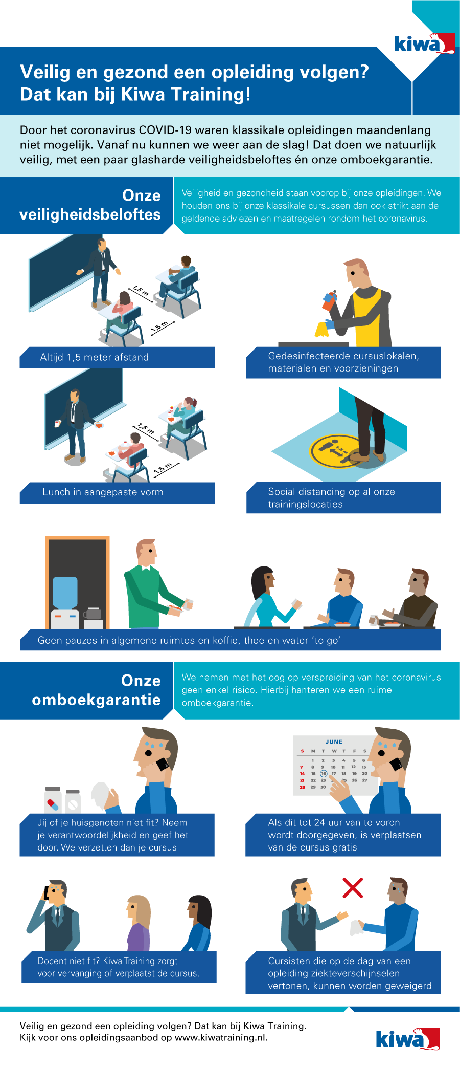 Bij de organisatie van de trainingen wordt natuurlijk rekening gehouden met de zogenaamde ‘anderhalvemetersamenleving’ en worden ook nauwkeurig de andere richtlijnen van het RIVM gehanteerd. Alle veiligheidsmaatregelen die Kiwa Training heeft getroffen worden in de onderstaande infographic weergegeven:
