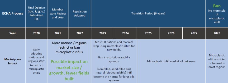 De EMEA Synthetic Turf Council (ESTC) heeft dit in een overzichtelijk schema weergegeven (zie onderstaand). Hierbij wordt uitgegaan van een overgangsperiode van zes jaar tot een uiteindelijk verbod op het gebruik van synthetisch infill op kunstgras sportvelden.