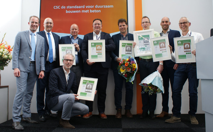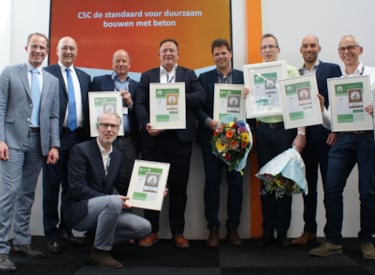 Deze zes bedrijven hebben in het eerste kwartaal van dit jaar met succes het proces van certificering afgerond. Een bijzonder moment was er voor Pieter Schraven, commercieel manager van Betonindustrie De Hamer. Hij ontving van Arjen van der Drift van Kiwa het eerste gouden CSC-certificaat in Nederland voor de prefab productielocatie in Nijmegen. De andere vestigingen van De Hamer (Heumen, Waspik) en Romein Beton, allemaal onderdeel van de BTE groep, ontvingen CSC-brons en CSC-zilver. De twee betonmortelfabrikanten Albeton en Betonmortel Nederland ontvingen CSC-zilver.