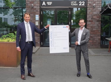 Max Hermers, General Manger Inntel Hotels Art Eindhoven krijgt Kiwa’s Keurmerk COVID-19 Preventiemaatregelen overhandigd van Michael van der Vlies, Divisiedirecteur Kiwa Management Systems.