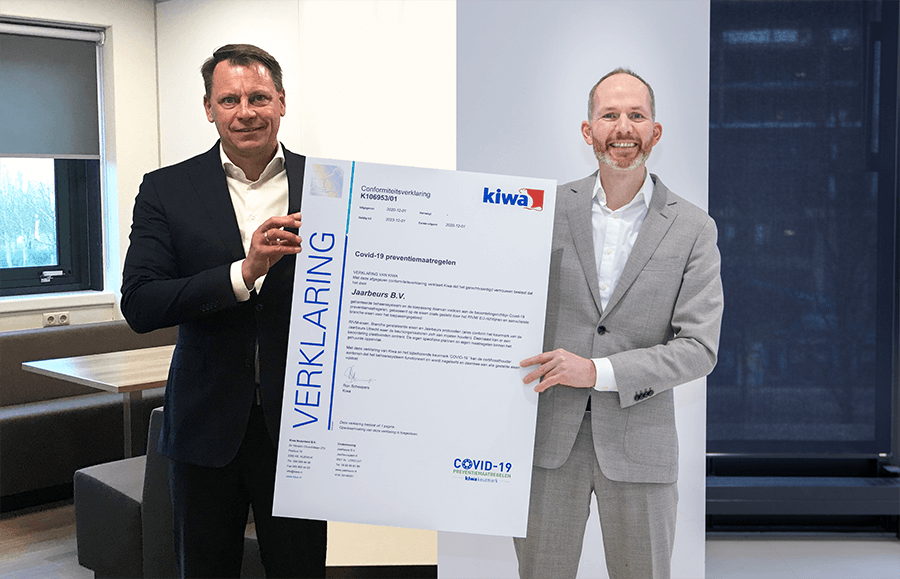 Vandaag heef Koninklijke Jaarbeurs Kiwa’s keurmerk COVID-19 preventiemaatregelen ontvangen. Het is daarmee de eerste evenementenlocatie van Nederland dat het keurmerk heeft behaald. Kiwa toetste in de afgelopen periode de maatregelen die Jaarbeurs heeft genomen om de eventuele verspreiding van het coronavirus tegen te gaan. Het keurmerk helpt de Jaarbeurs gasten en bezoekers te laten zien dat beurzen, congressen en andere bijeenkomsten volgens de hoogste veiligheidsnormen plaatsvinden.