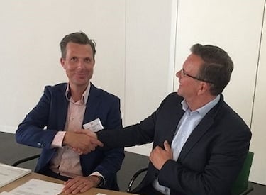 Mathijs van Ballegooijen (Kiwa) en Tonko Wedda (WDTM) bezegelen het contract