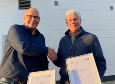 Photo: Bert van Erkel from Kiwa hands over the certificate to Claus Hundhausen from Hundhausen Kunststofftechnik on November 16, 2022.